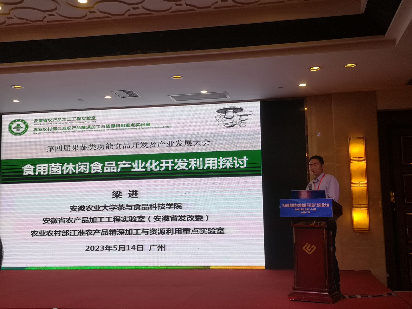 2023年5月12-14日,安徽省农产品加工工程实验室常务副主任梁进教授应邀参加在广州举办的第四届果蔬类功能食品开发及产业发展大会,并做了题为“食用菌休闲食品产业化开发利用探讨”交流报告。