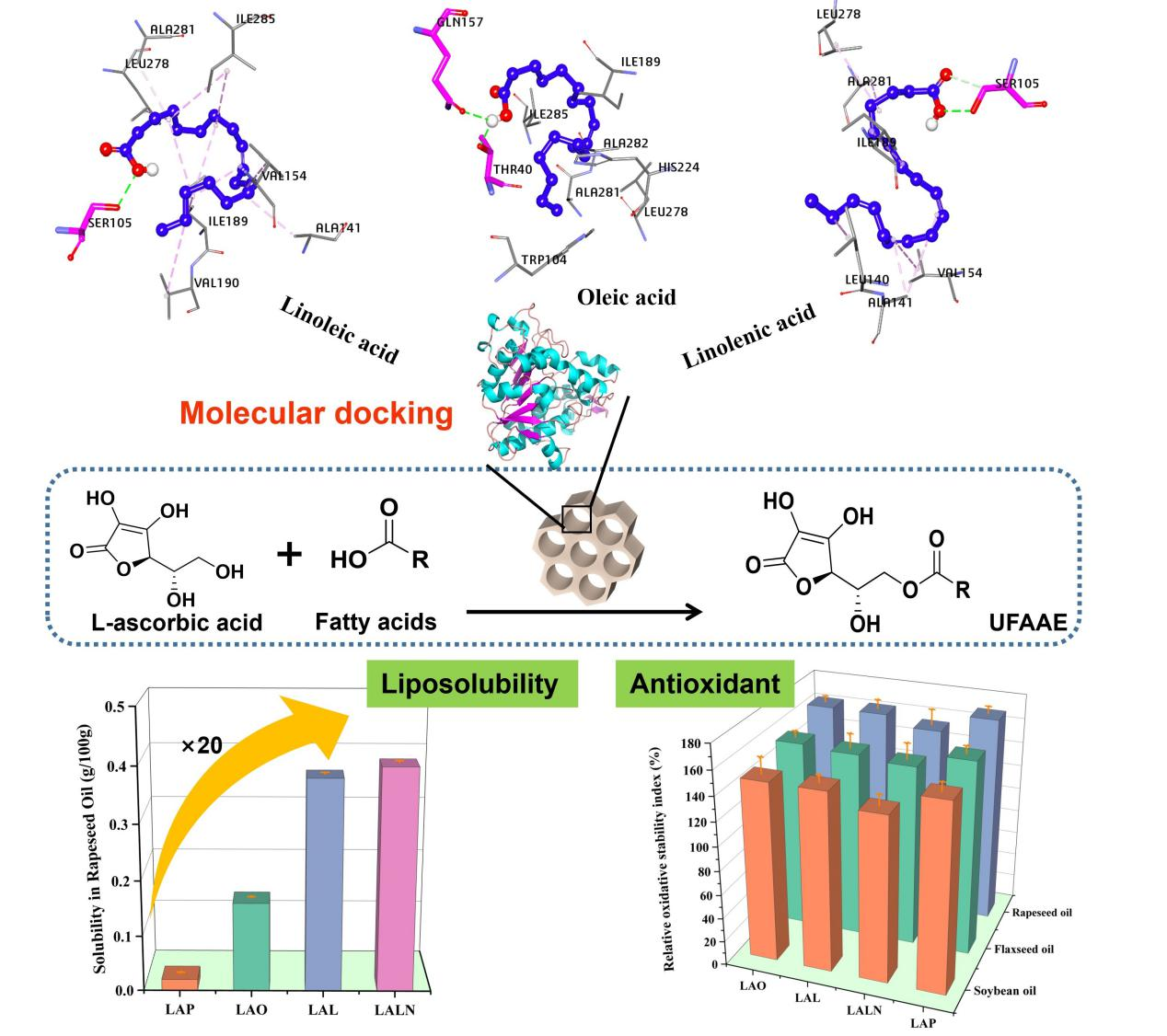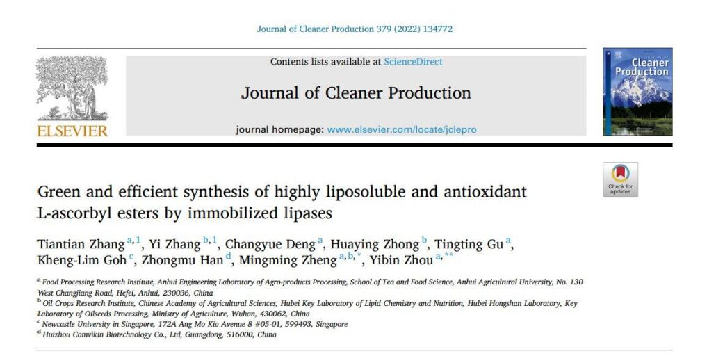 近日,以安徽农业大学为第一单位,中国农科院油料所为第二单位,在郑明明教授和周裔彬教授共同指导下,2020级茶与食品科技学院硕士研究生张甜甜在国际顶级学术期刊清洁生产《Journal of Cleaner Production》(中科院一区,IF=11.072)发表了最新研究成果“Green and efficient synthesis of highly liposoluble and antioxidant L-ascorbyl esters by immobilized lipases”。该研究针对高活性酶催化剂被国外企业垄断的问题,提出了一种清洁、高效的固定化酶催化制备油脂抗氧化剂L-抗坏血酸不饱和脂肪酸酯的新方法,创建了高活性的有序介孔脂肪酶微阵列CALB@OMS-C8,其催化活性可以达到20.8 M g-1 h-1,较游离酶提高了8倍,创造了L抗坏血酸酯的最高催化活性纪录。同时,创制出L-抗坏血酸油酸酯、L-抗坏血酸亚油酸酯和L-抗坏血酸亚麻酸酯3种新型油脂抗氧化剂,并阐明了脂肪酶与油酸、亚油酸、亚麻酸的分子对接规律,计算出脂肪酶CALB和脂肪酸的结合能顺序为:亚麻酸(-18.8 kJ/mol)>亚油酸(-15.4 kJ/mol)>油酸(-9.2 kJ/mol),进一步从理论上揭示了脂肪酸结构对酯化难易程度的影响规律。通过使用油酸、亚油酸、亚麻酸等不饱和脂肪酸替代棕榈酸作为酰基供体,较商品化的L-AP,熔点降低50oC以上,脂溶性提高7~20倍,抗氧化能力相当,可以显著拓展应用范围和场景。本论文为功能性脂质的酶法制备提供了新方法,为油脂和食品抗氧化提供了溶解性好,效率高的新型抗氧化剂,具有较强的产业化应用前景。